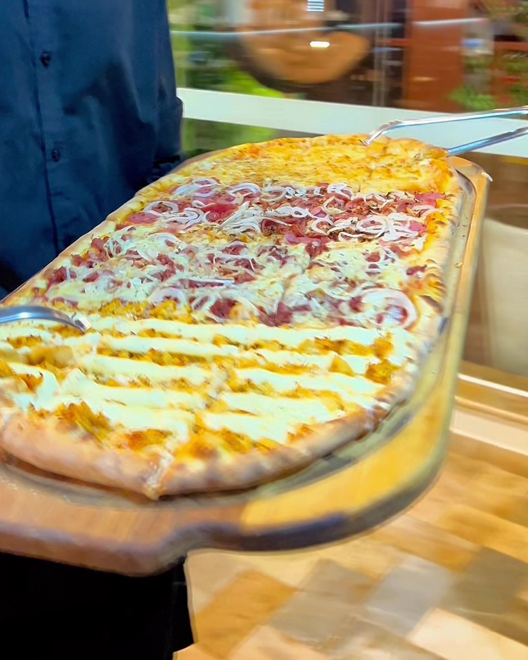 Aqui você encontrará vários sabores de pizzas, guirlandas, pizza trem, esfihas e calzones, e nas bebidas, temos drinks, chopps, cervejas, destilados, sucos e refrigerantes! – Sim, é bem completo!